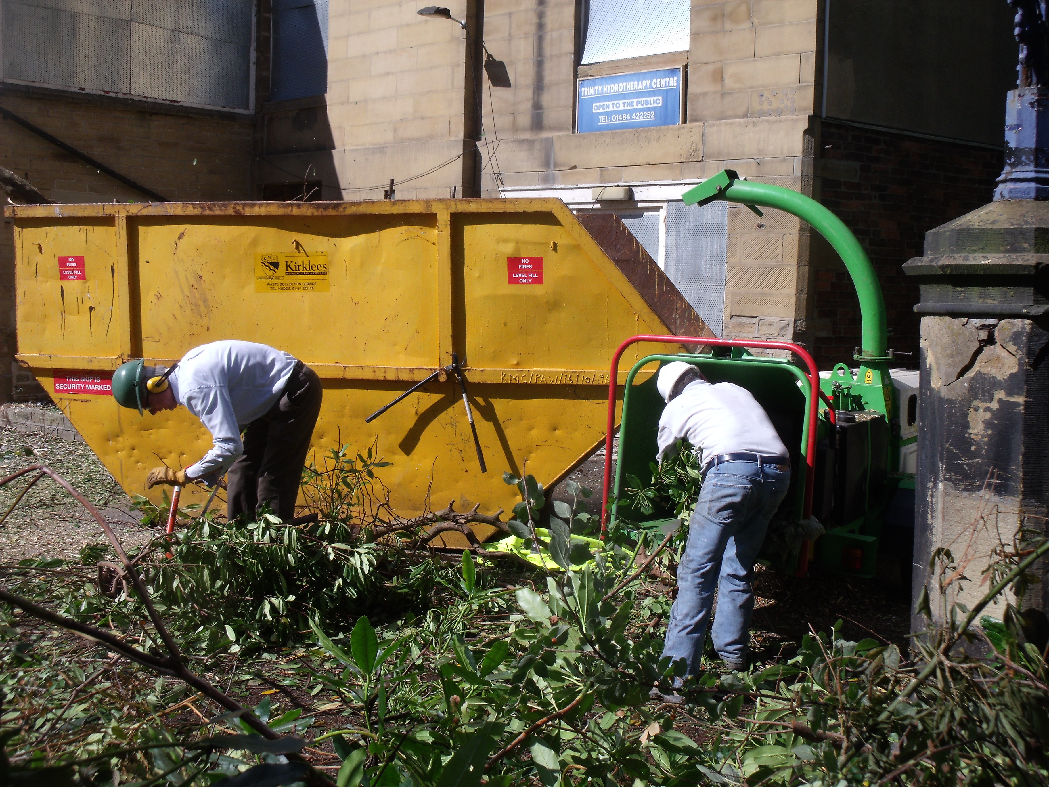 Lots of people, including the community police, community payback, some scouts and lots of people from the church were clearing the churchyard from lots of overgrown trees, mostly rhododendrons. There was a lot of wood cleared the filled a very large skip with chippings from a chipper. plus enough over for half a second skip.