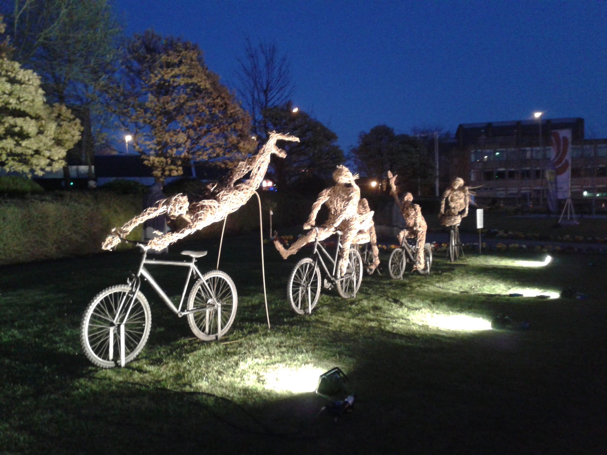 Then off to Dewsbury, where there was a free outdoor show (the best sort) The story of the rivalry of two Italian cyclists in an overhead production. Singers dancers and even cyclists were suspended from a giant crane alongside Dewsbury to tell the story of te rivalry of the cyclists Bartali and Coppi. It looked like this – there wasn’t enough light to take anything that wasn’t iluminated.