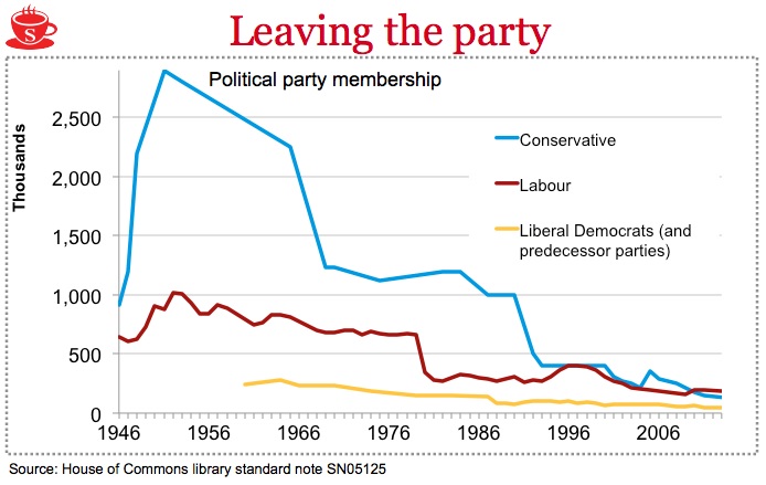 Not good for the Conservatives in particular, but here is decline across the board. The biggest decline being duing Margaret Thatcher’s time as Prime Minister when the Conservative membership went from 1.2 million down to around 400,000. That’s two thirds of the party membership.