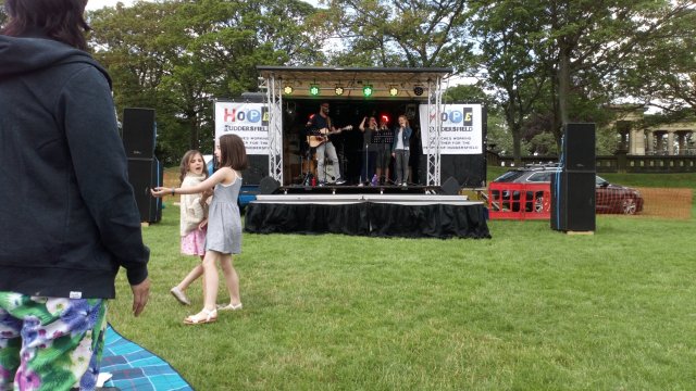 A change from the usual this week. Instead of worshipping in Holy Trinity Church in Huddersfield we joined together with people from other churches to praise God together and have a picnic as part of Hope Huddersfield in Greenhead Park. Not that it was further for us to go, the picture above shows the tower of Holy Trinity which stands across the road from the park above the tree line. A casual feel for a worship service. A few people brought their dogs and children joyfully danced at the front while the worship band were playing. It was a beautiful sight.