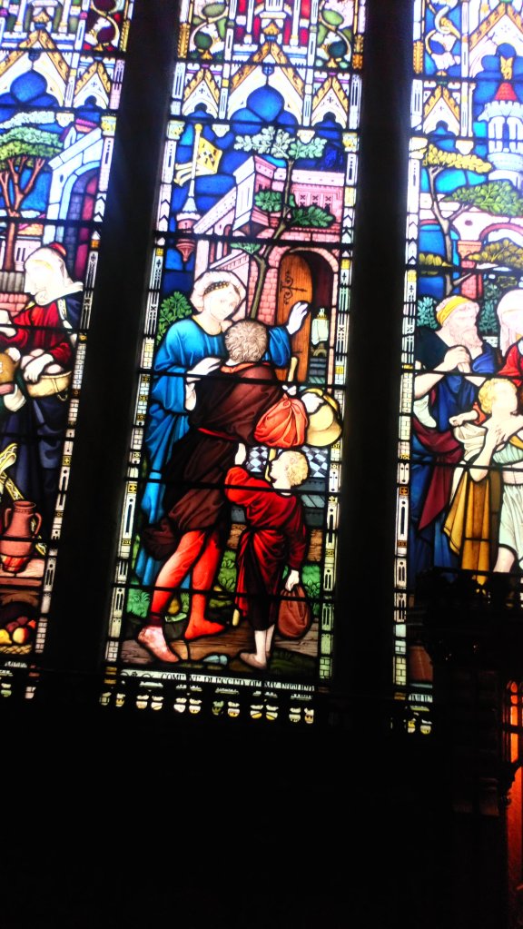 I have previously written about the stained glass in Holy Trinity Huddersfield, how it depicts the welcoming of strangers to the town and the Belgian refugees who ran much of the textile industry during the World War I. Another of my blogs was about how John Wesley saying the people of Golcar, above Huddersfield, were “like lilies.” The area had been settled by the Huguenots, French protestants escaping the persecutions of Louis XIV, the Sun King; They had brought with them lilies of the valley which grow in the area they settled. The Golcar Lily Pub, on Bolster Moor, is named after Wesley’s comment and by extension point to the welcome of the Huguenots in the 16th century.