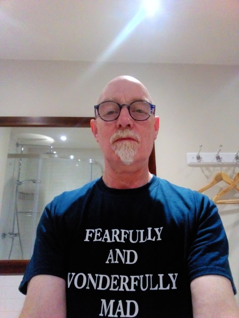 I am known for my t-shirts. From geeky designs such as the workshop manuals of the droids R2D2 and C3PO from the Star Wars films to a Human Ingredients design bought at the Science Museum, let’s face it, you have to be a geek to buy t-shirts from there. Then there are the slogan ones, I bought one saying ‘Stereotype’ as a protest at the way autistic people like myself are often stereotyped, a cartoon of a man falling off a bicycle with the caption, ‘I do all my own stunts’ and one I had printed saying ‘perfetcionist’ which suits me because I am never content with the quality of what I do, so perfectionist spelled wrong is perfect for me. There is one which the people at church really like, also my own design, which says in large print, ‘fearfully and wonderfully mad’ and in small print ‘Psalm 139:14 abridged.’