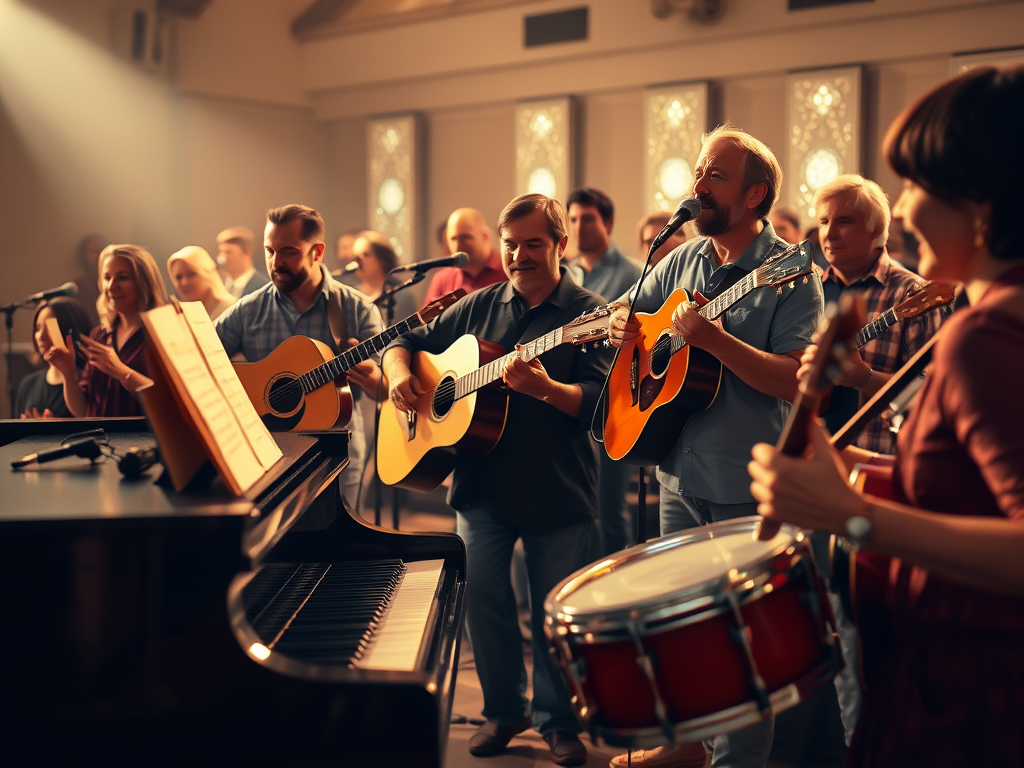Just for giggles, this is an AI-generated masterpiece using the words “music, instruments, worship.” I’m scratching my head over what the fellow on the far right is wielding as a drumstick. And what’s up with the guitarist in the blue shirt next to him? His microphone has a lead but no stand; it’s just defying gravity like a rock star on a caffeine high!